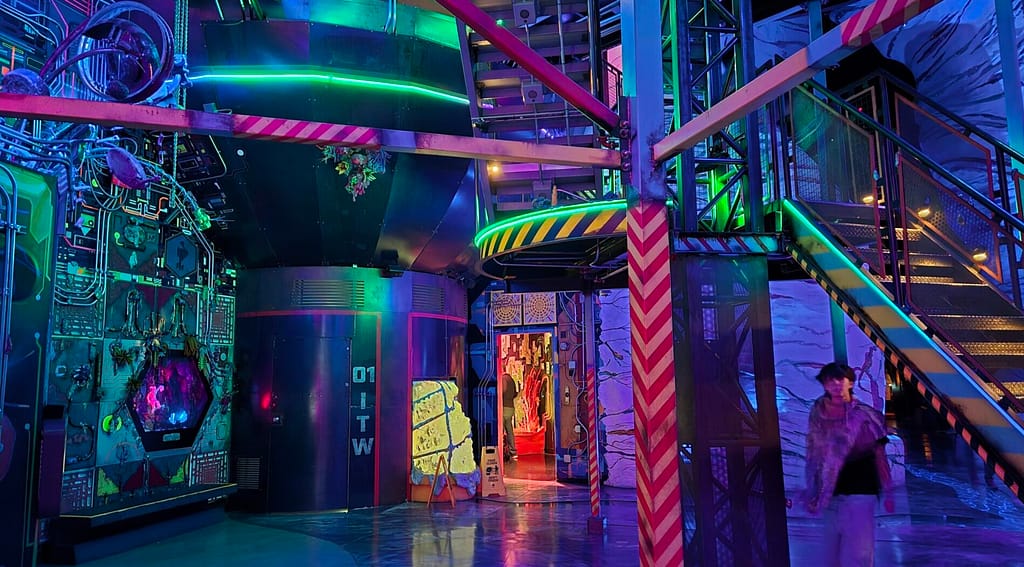 Chi lo desidera può seguire una trama narrativa: una multinazionale misteriosa, esperimenti fuori controllo, realtà parallele che collidono. Attraverso indizi, terminali, documenti e interazioni digitali, il visitatore può ricostruire il puzzle… oppure semplicemente godersi l’esperienza visiva.